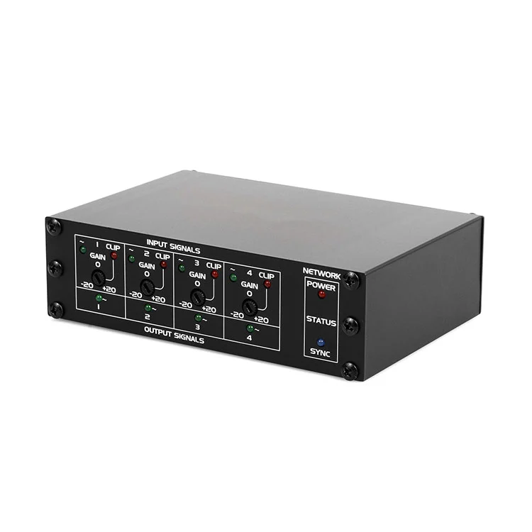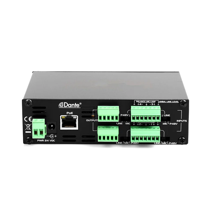 De 4 Mic og Line -input Dante -interface er en professionel lydgrænseflade baseret på Dante Network -protokol, der understøtter 4 mikrofon/linjeindgange og 4 output. Dens kernefordel er at transmittere lydsignaler med høj kvalitet, lav latens-signaler gennem IP-netværk, som er velegnet til scenarier, der kræver fleksible ledninger, fjernoverførsel eller multikanals lydintegration. Det er velegnet til live lyd, vejkast/streaming-produktion, konferencesystem, uddannelsesmæssige spillesteder er egnet og så videre.