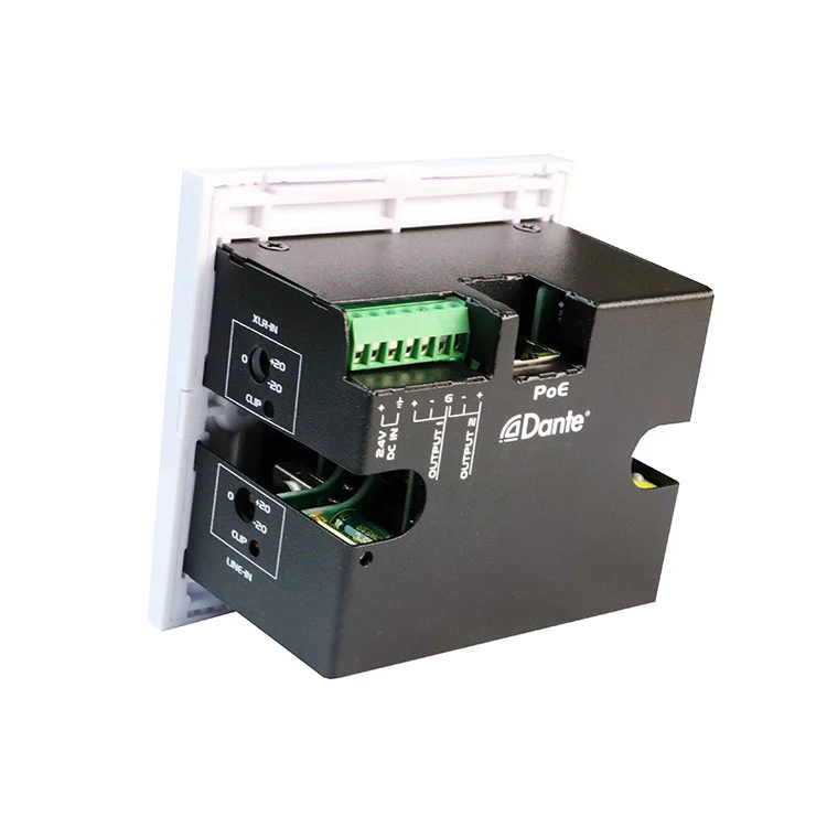2Ch Dante-interface 2 Mic/Line-indgange X 2 Outputs Interface Panel er perfekt til professionelle lydapplikationer, såsom konferencelokaler, live lydopsætninger, udsendelsesstudier og installerede AV-systemer, hvor pålidelig Dante-til-analog og analog-til-Dante-konvertering er påkrævet i en kompakt, rack-fri formfaktor. Dets vægmonterede design giver mulighed for ren og effektiv integration i forskellige miljøer, mens den opretholder lydydelse af høj kvalitet.