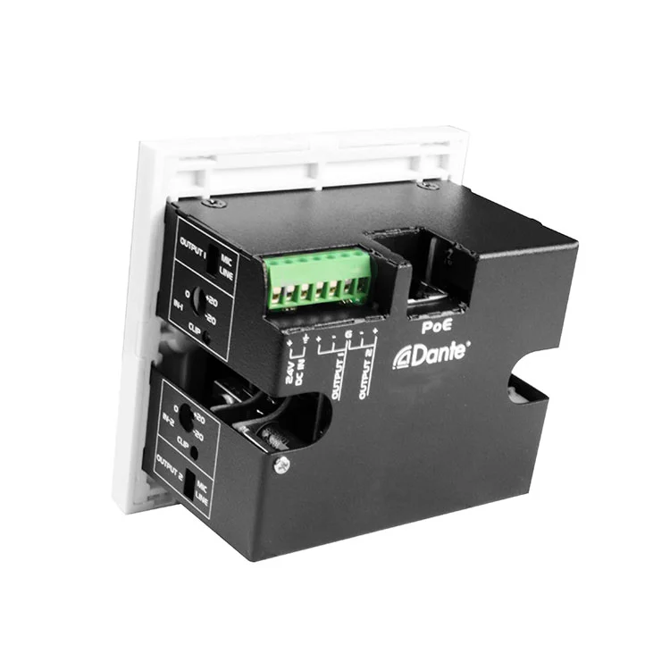 2Ch Dante-interface 2 Mic/Line-indgange X 2 Outputs Interface Panel er perfekt til professionelle lydapplikationer, såsom konferencelokaler, live lydopsætninger, udsendelsesstudier og installerede AV-systemer, hvor pålidelig Dante-til-analog og analog-til-Dante-konvertering er påkrævet i en kompakt, rack-fri formfaktor. Dets vægmonterede design giver mulighed for ren og effektiv integration i forskellige miljøer, mens den opretholder lydydelse af høj kvalitet.